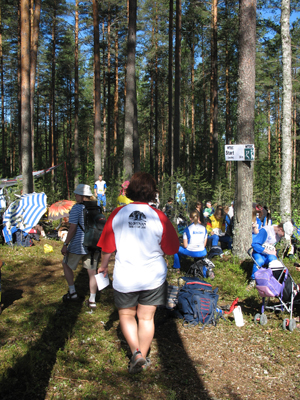 Jaz sem imel še nekaj časa, da sem se lahko pripravil. V mislih sem imel predvsem časovni kontroli, ki sta me čakali. Ko je prišel čas zame, sem se odločno odpravil. Videl sem dva baldahina, okoli katerih je okolico zakrival visok zastor. Pozdravila me je sodnica in napotila k mizi pod baldahin. Ko sem se približal sem na hitro pogledal proti terenu in opazil tri zastavice relativno blizu, dve pa prek grape. Le eno zastavico sem ocenil kot možno jamo, preostale pa kot nič posebno značilnega, mogoče kakšen nos. Sodnica mi ni pustila, da bi si posebej dolgo ogledoval kontrole, vprašala je le ali vidim pet zastavic in jaz sem si vzel še malo časa, da sem na glas ponovil A, B, C, ... Takoj nato je postavila orientirano karto na mizo in čas sta pričela meriti dva časomerilca ob strani. Na karti je bila označena jama, ki se je nahajala prek grape in ne bistveno nižje od stojišča. V odgovor sem bil siguren: »Si!« in pokazal na C. Sodnica je odgovor zapisala, časomerilca pa sta ji povedala še čas, »kolme« in »neljä«. Skupno torej tri in pol sekunde. Nato sem se prestavil k sosednjemu baldahinu in zadeva se je ponovila. Pogledal sem proti kontrolam in opazil zalivček, utico in štiri zastavice. Dve zastavici sta bili nad zalivčkom na možni grapi, ena na polotočku ob zalivčku in še ena malo višje. Opis je tokrat predstavljal severni del nosu. Le ena kontrola je ustrezala lokaciji na karti. Odgovoril sem: »Di«. Tokrat sta bila oba časomerilca enotna »kahdeksan«, osem sekund. Zadovoljen z rezultatom in prepričan v njihovo točnost sem zelo motiviran odšel do štartnega mesta, kjer sem dobil karto.