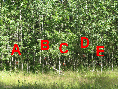 Na naslednji kontrolni točki sem naredil napako. Ko sedaj gledam na to, je bila napaka storjena, ker nisem dobro prebral opisa kontrole, SZ del goščave. Od začetka sem imel v glavi SZ vogal. Ker se je goščava dotikala plastnice, sem gledal le na dve nekoliko dvignjeni zastavici. Sicer je to bila zelo zahtevna kontrola, ker so vse zastavice bile v goščavi in videti se jih je dalo le skozi goščavo. Organizatorji so po tekmovanju povedali, da si na tem mestu s kompasom nismo mogli pomagati zaradi lokalne deviacije, ki je znašala približno 10 stopinj. Tudi drugače ni bilo možno z zanesljivostjo uporabiti kompasa, ker ni nikjer bilo primernega stojišča, zastavice pa so si bile preblizu. Zato sem položaj prave zastavice poskušal določiti z opazovanjem celotne goščave in potekom najbližje plastnice. Odločil sem se za odgovor B, ki je bil najbližje pravemu odgovoru C.