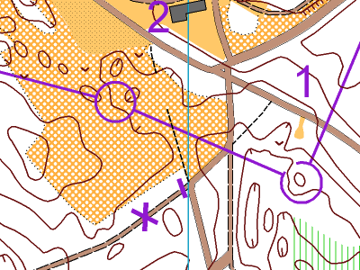Medtem, ko se je prvo kontrolo, JV del hribčka, dalo rešiti z pozornim opazovanjem reliefa in kontrolnimi meritvami azimutov, je bila 2. kontrolna točka zame najtežja doslej. Plitva grapa, oddaljena 50 m od poti in pet zastavic. Kontrola bi morala biti v podaljšku ene izmed vrtač in ob hribčku. Vse skupaj sredi grobo odprtega terena s posameznimi drevesi. Na prvi pogled so mi odgovarjale kar tri zastavice. Ko sem eno izločil, sem pomislil na drugo možnost in spet se mi je izločena zdela možna. Tu je še vedno bila tudi možnost Z odgovora. Naloge sem sem se najprej lotil z ogledom terena in detajlov na karti, nato z merjenjem azimutov. Poskušal sem tudi meriti z vzhodne poti, vendar se je dalo videti le vrhove večjih brez. Poskusil sem tudi s pomočjo smeri, ki ga je določala pot, ki je vodila od štarta in jo povezoval z vogalom vegetacije, vendar tudi to ni bilo zanesljivo, saj je bila preširoka. Malo sem že obupaval, kako bi se lotil zadane naloge in se potem zavestno pomiril. Določil sem vrtačo, ki bi morala biti pred kontrolno točko. Bila je zasuta z vejami in ob grmu za njo tudi ena izmed zastavic. Spraševal sem se, če ni slučajno jama manjša in bi ta zastavica lahko bila že prava. Zaradi položaja hribčka sem se končno odločil za C zastavico. Ta naloga mi je vzela zelo veliko časa.